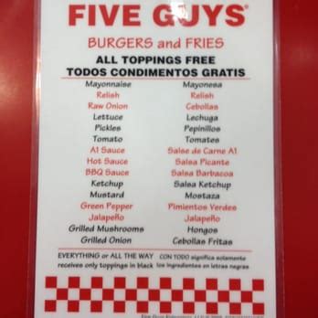 5 Guys Toppings. Web five guys “all the way” is a burger that comes with three sauces and five toppings. Grilled mushrooms are also a popular hot topping.